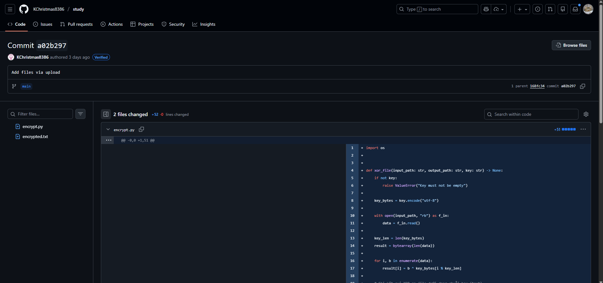Thấy có sửa đổi ở file encrypt.py và encrypted.txt, file encrypt.py chứa flag phần 3: _v3_l3u_l3U_m4y_b4n