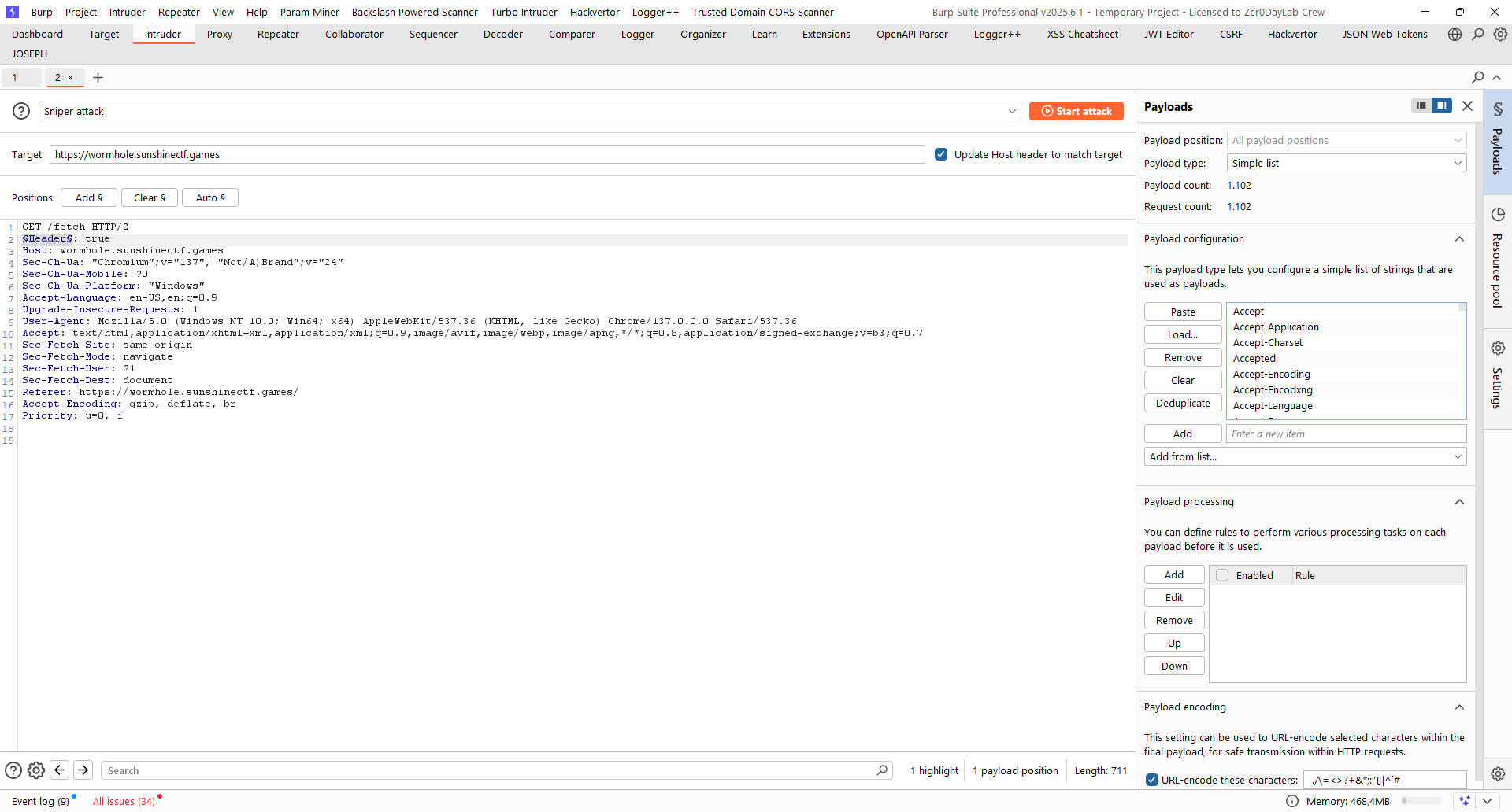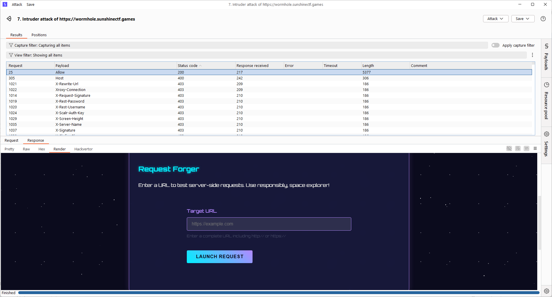 Nó bảo lỗi thiếu access header và trong đề bài cũng gợi ý mình fuzzing vậy mình sẽ dùng Burp Intruder để tiến hành brute-force tìm ra header thỏa mãn bài này