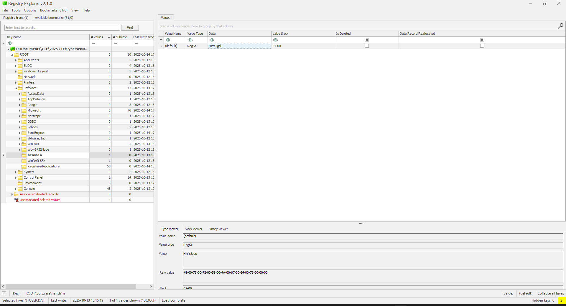 Nó sẽ đọc Registry ở phần Hive SOFTWARE\\hensh1n, vậy mình sẽ trích xuất NTUSER.DAT ra để xem hive SORTWARE