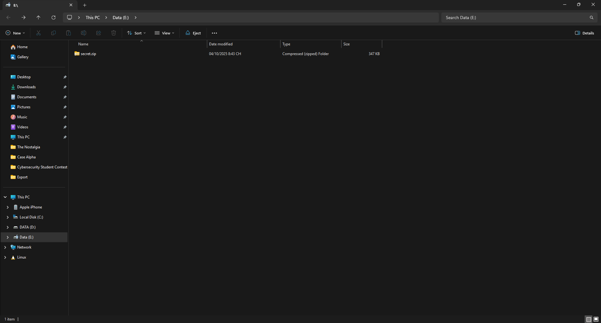 Khi làm đến đây thì mình nhận ra là bài này có vẻ không cần key của BitLocker để mở khóa ổ cứng ngoài làm gì trong khi secret.zip đã bị lộ từ trước (Ở phần Tìm kiếm file phía trước), vậy nên mình cũng dismount ổ E và quay lại làm việc với file secret.zip từ trước với mật khẩu đã tìm được từ SimpleNote, có thể đây là một rabbit-hole mà btc cố tình dụ người chơi vào hoặc một lỗi của đề, mình cũng không chắc