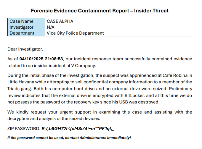 Đề bài cho chúng ta một tình huống như sau: Một nhân viên trong công ty V là nội gián, anh ấy đã mang ổ cứng máy tính và ổ cứng ngoài - thứ chứa tài liệu mật, mang ra ngoài để bán, ổ ngoài đã bị mã hóa bởi BitLocker và điều tra viên cần mình giúp đỡ giải mã