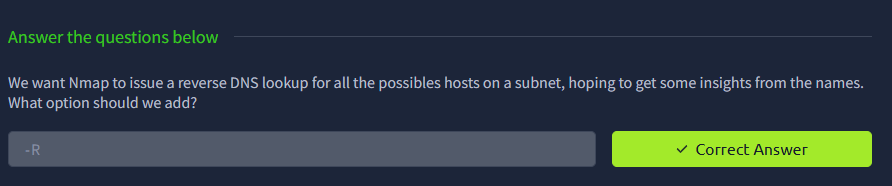 Theo mặc định, Nmap chỉ tra cứu DNS cho các host online; tuy nhiên, bạn có thể dùng tùy chọn -R để truy vấn DNS ngay cả với các host offline. Nếu muốn chỉ định máy chủ DNS cụ thể, hãy thêm tùy chọn --dns-servers DNS_SERVER.