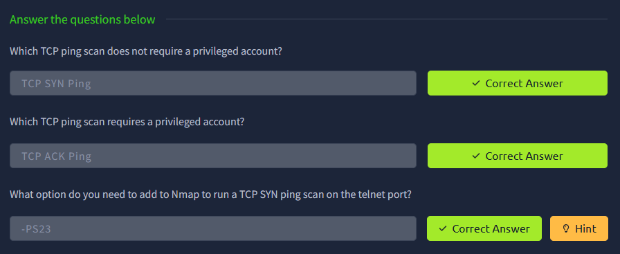 | TCP SYN Ping Scan | sudo nmap -PS22,80,443 -sn MACHINE_IP/30 |