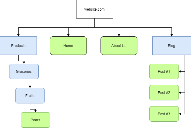Các hình chữ nhật màu xanh biểu thị tuyến đường đến nội dung lồng nhau, giống như một thư mục, ví dụ “Products” của một cửa hàng. Còn các hình chữ nhật bo tròn màu xanh lục biểu thị một trang thực sự. Tuy nhiên, đây chỉ là để minh họa - ngoài thực tế “Sitemaps” không trông như vậy. Chúng sẽ giống với thứ này hơn: